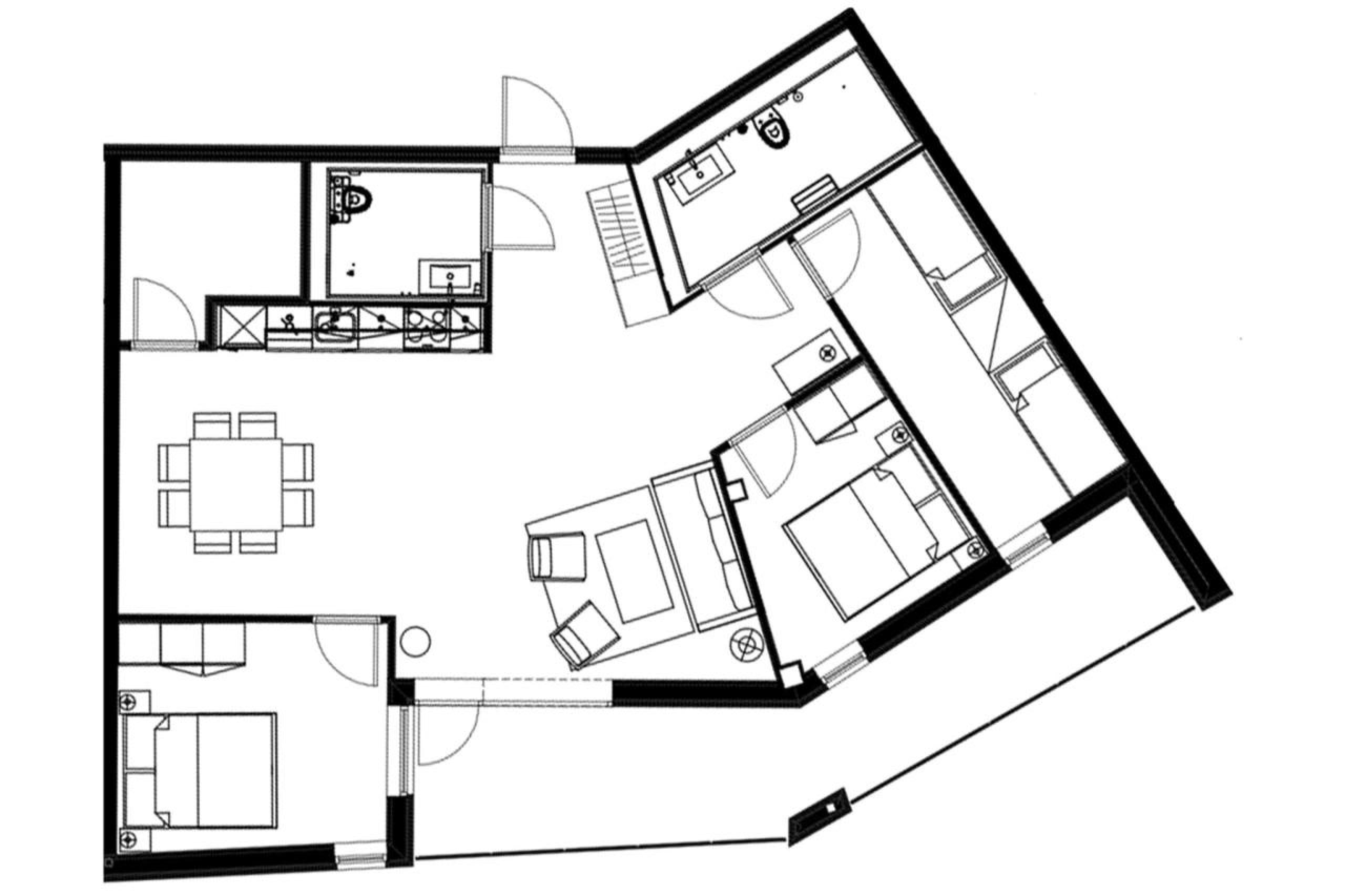 Ferienwohnung befindet sich auf Ebene 2, Lodge Suites, 8 Gästebetten, 85 m², Wohnzimmer mit integrierter Küche, 3 Schlafzimmer, 2 Duschen, 2 WC.
