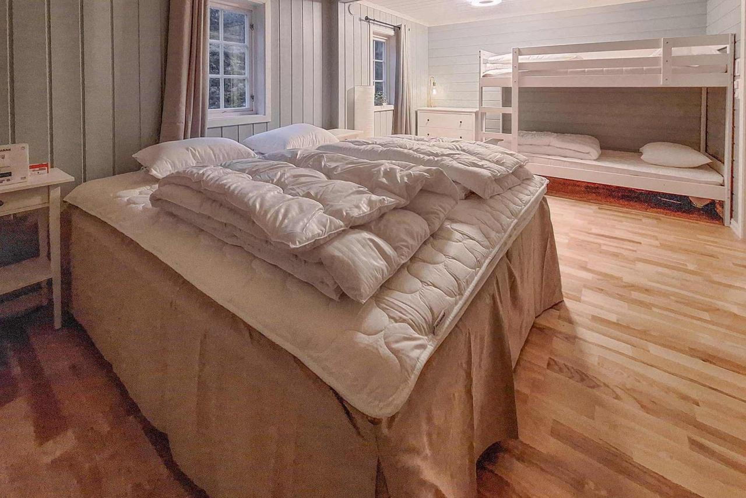 Schlafzimmer 1= 1 Doppelbett, 180 cm breit. Schlafzimmer 2= 1 Doppelbett, 180 cm breit. Schlafzimmer 3= 1 Doppelbett, 160 cm breit. Schlafzimmer 4= 1 Doppelbett, 150 cm breit. Schlafzimmer 5= 1 Doppelbett, 160 cm breit, 1 Etagenbett 90 cm breit.