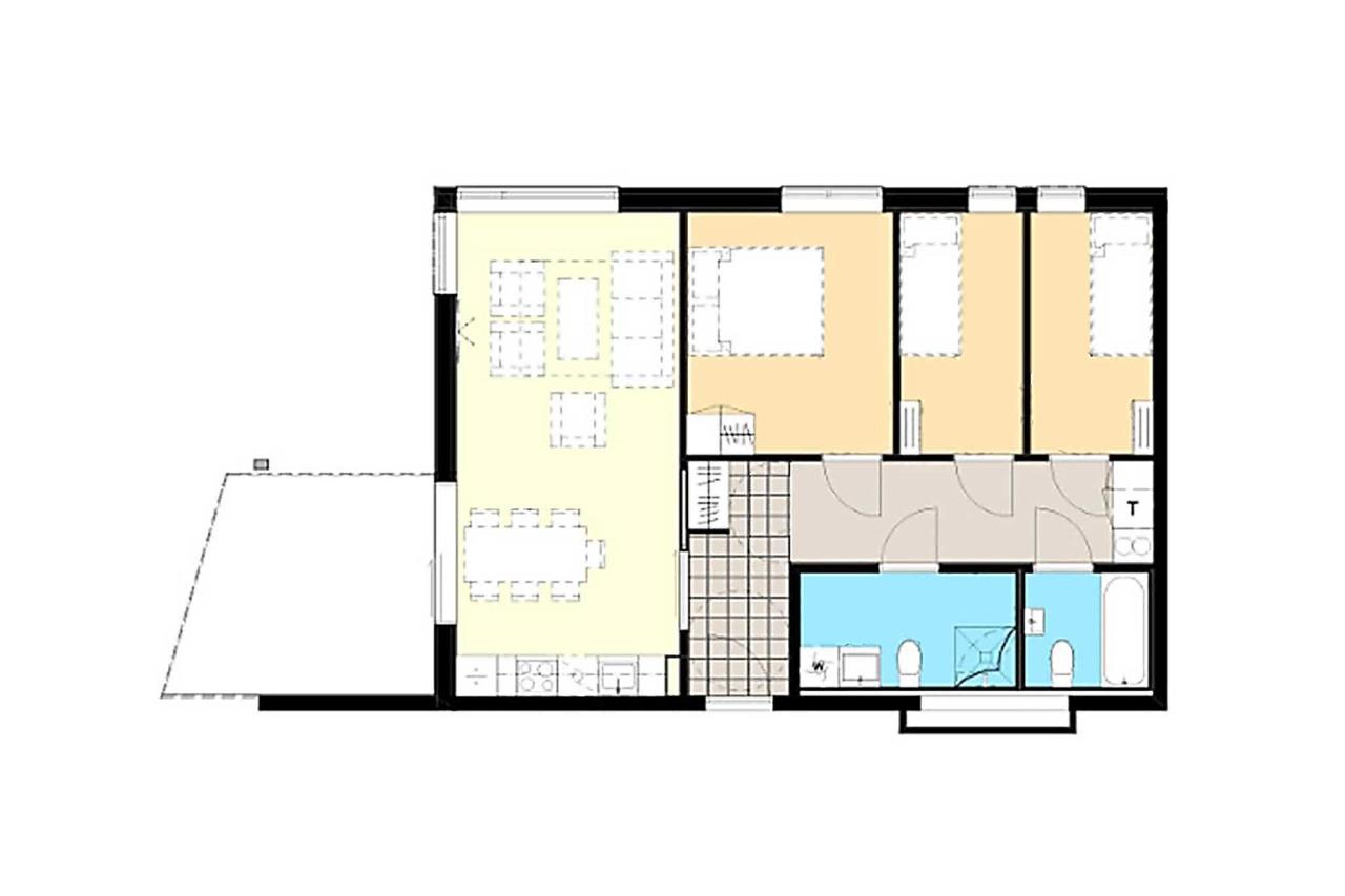 Ferienwohnung im ersten Stock, 6 Gästebetten, 74 m2, Wohnzimmer mit integrierter Küche, 3 Schlafzimmer, 2 Duschen, 2 WC.
