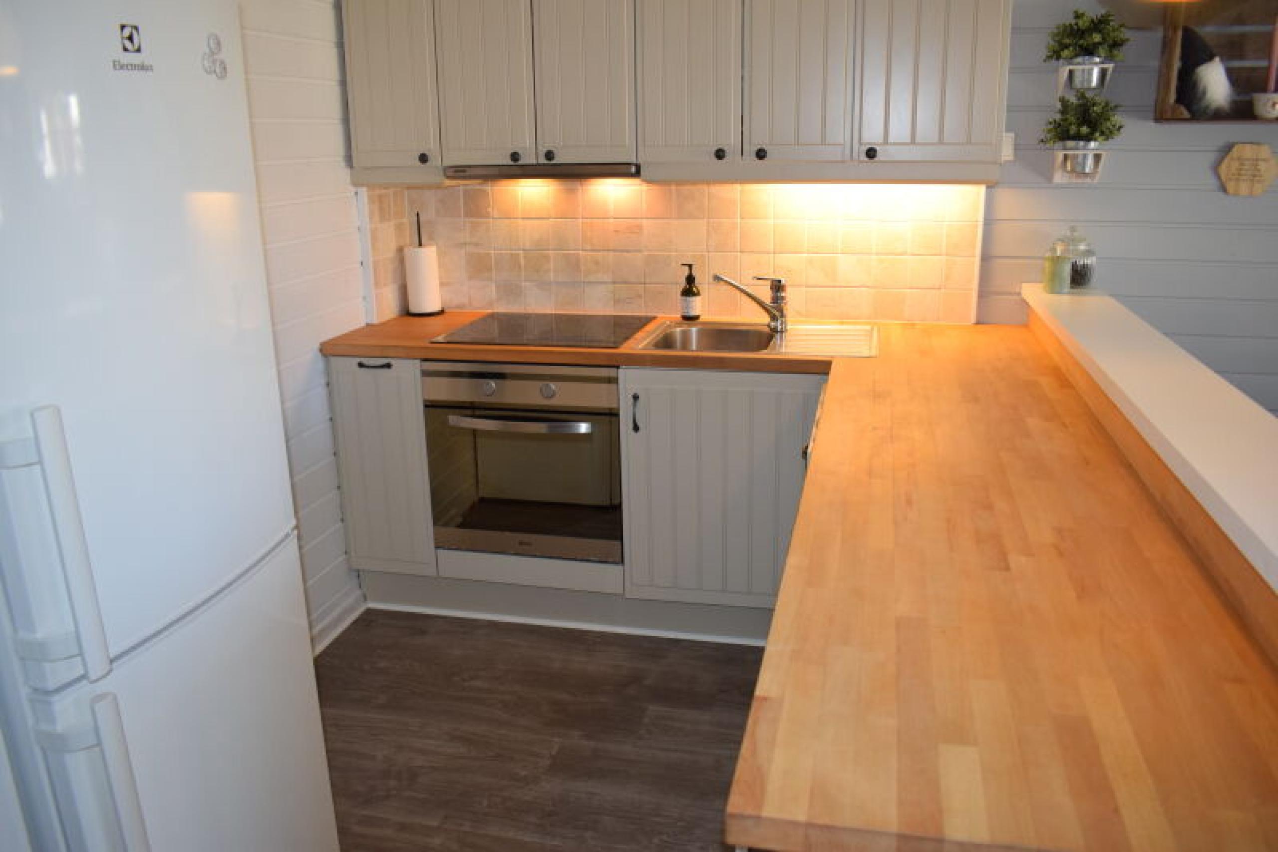 Die Küche ist ausgestattet mit Herd, Ofen, Kühlschrank mit Gefrierfach, Kaffeemaschine, Wasserkocher, Geschirrspüler und Mikrowelle